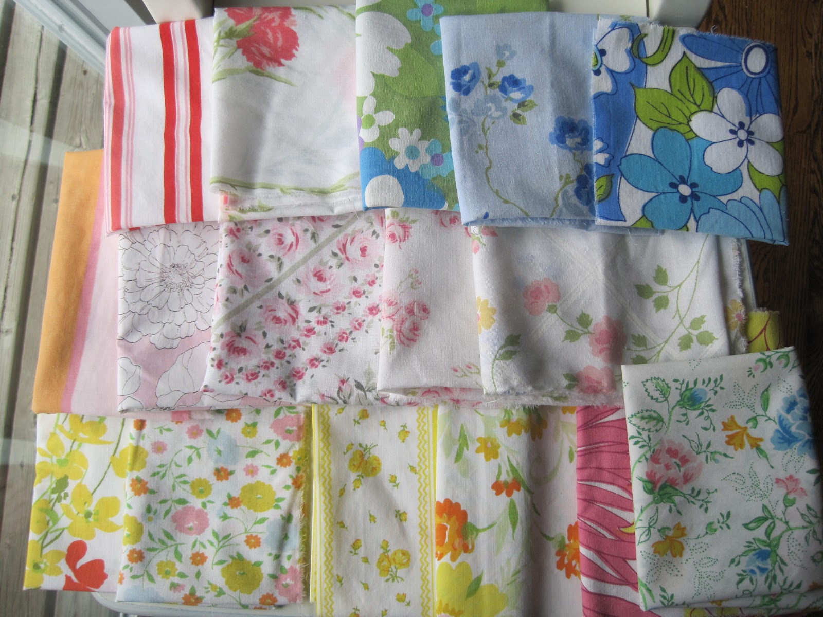 I'm happy to participate for the first time! Since I love vintage sheet fabric so much, I have put together a rainbow scrap pack. There are 16 different prints of beautiful vintagey goodness. They are a variety of sizes, some smaller, some close to fat quarter size. They weight just over 11oz.